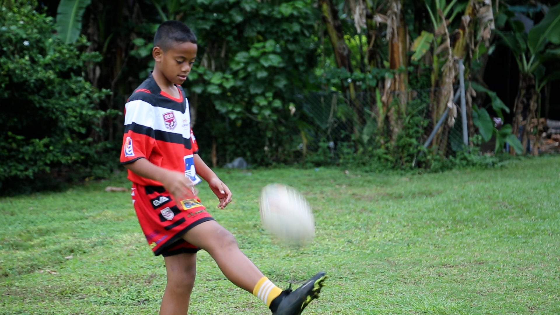 Ilifeleti, 11 years old, kicks a rugby ball during training. Photo: WHO/Renagi Taukarai